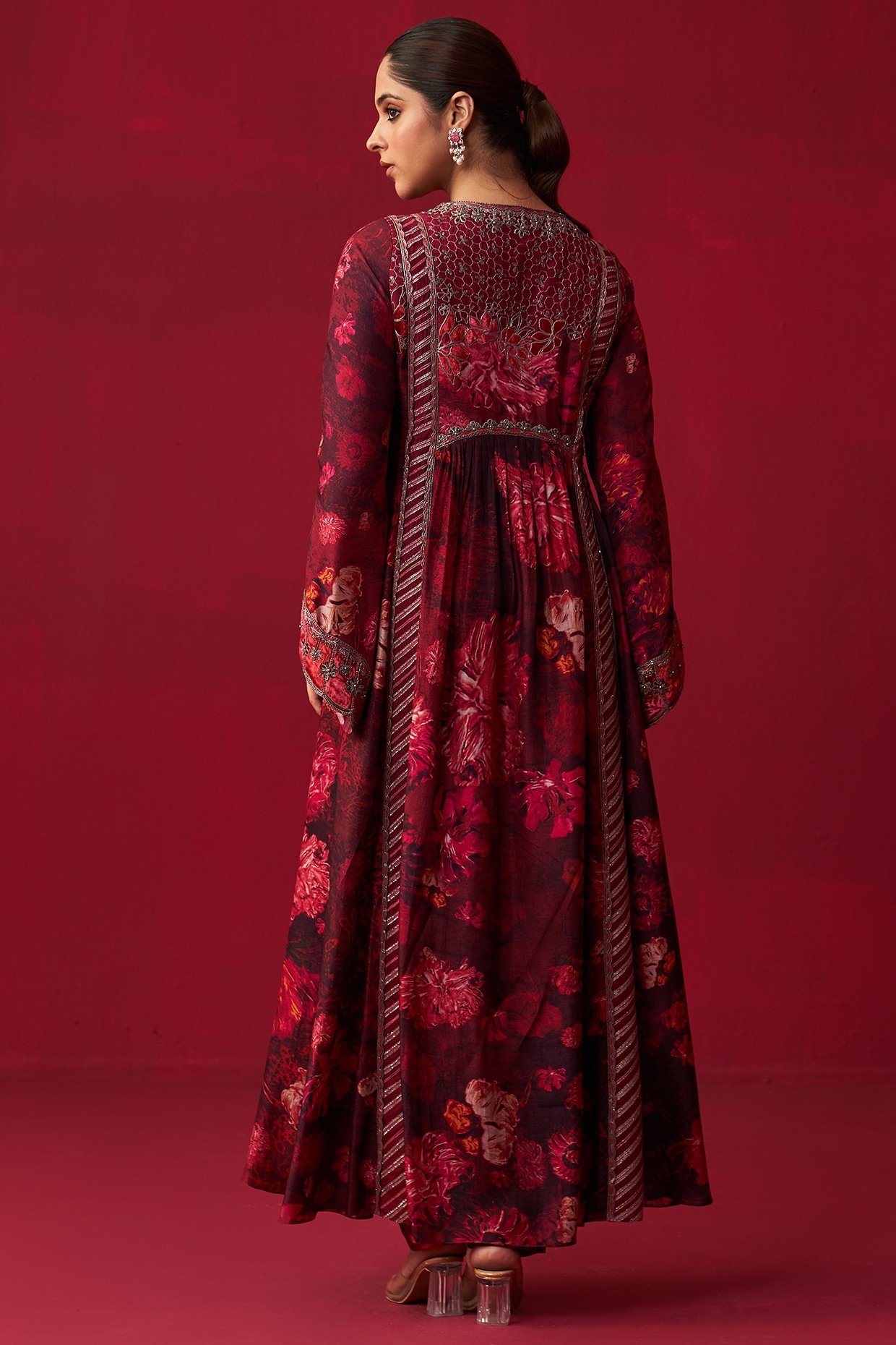 • Pink floral print kurta with velvet patchwork embroidery. Comes with Russian silk pants
