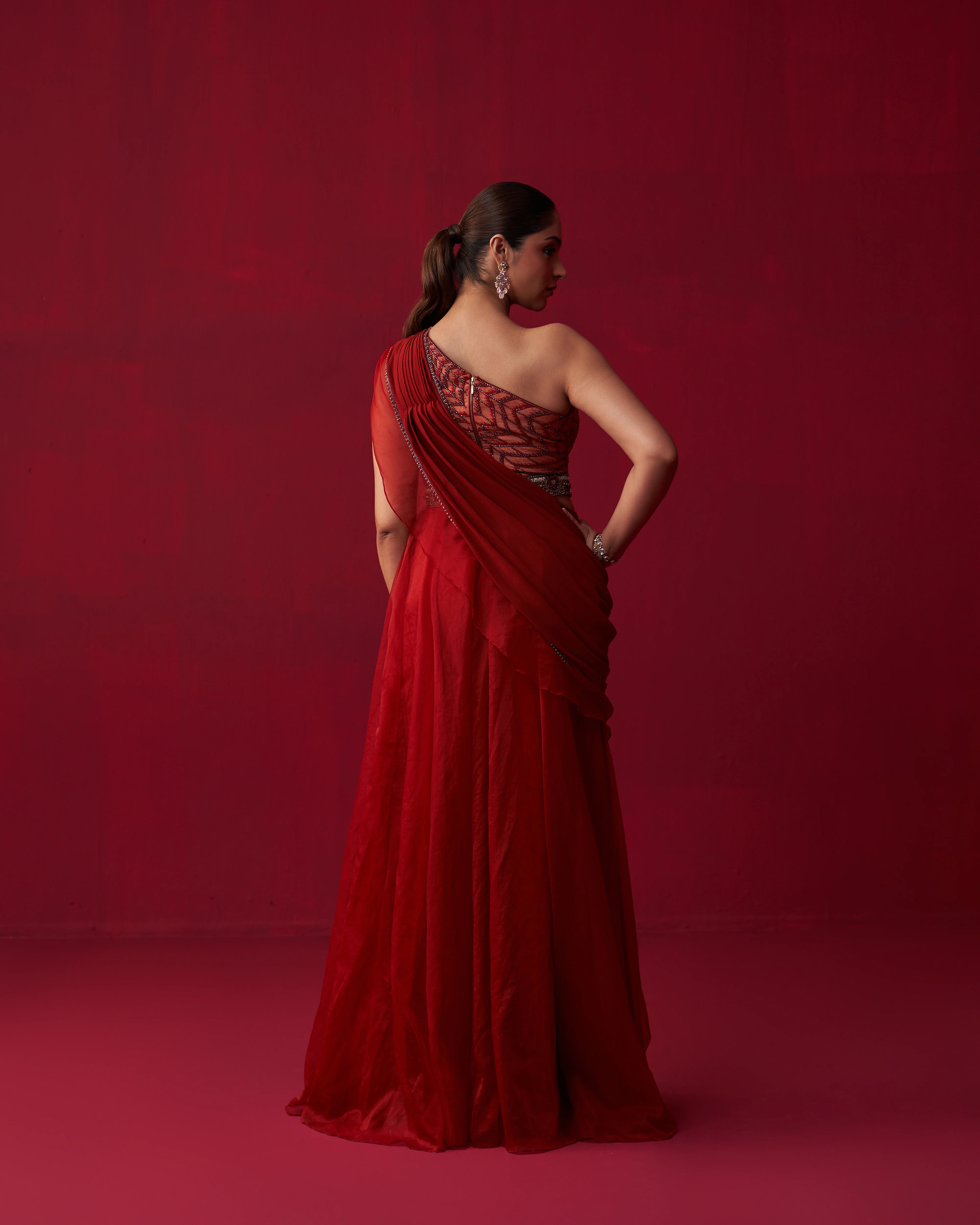 • Red georgette draped top with alluring embroidery. Comes with cut dana work belt and organza palazzo