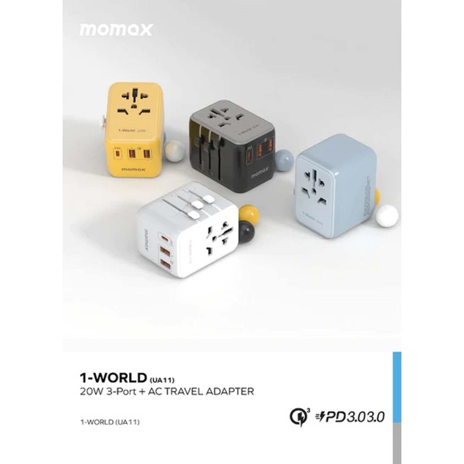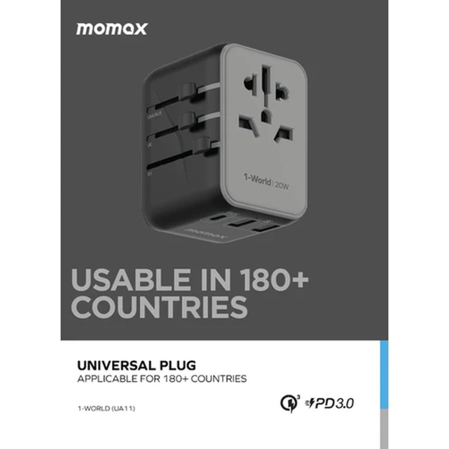 Momax UA11 USB-C PD 3.0 20W. A travel companion for ultimate fast charging on-the-go. A universal travel charger with Built-in JP/US, AU, EU, UK sockets. Fast charging up to 5 devices. 20W power output to support fast charging even for iPads. Fast charging adapter perfect for traveling.