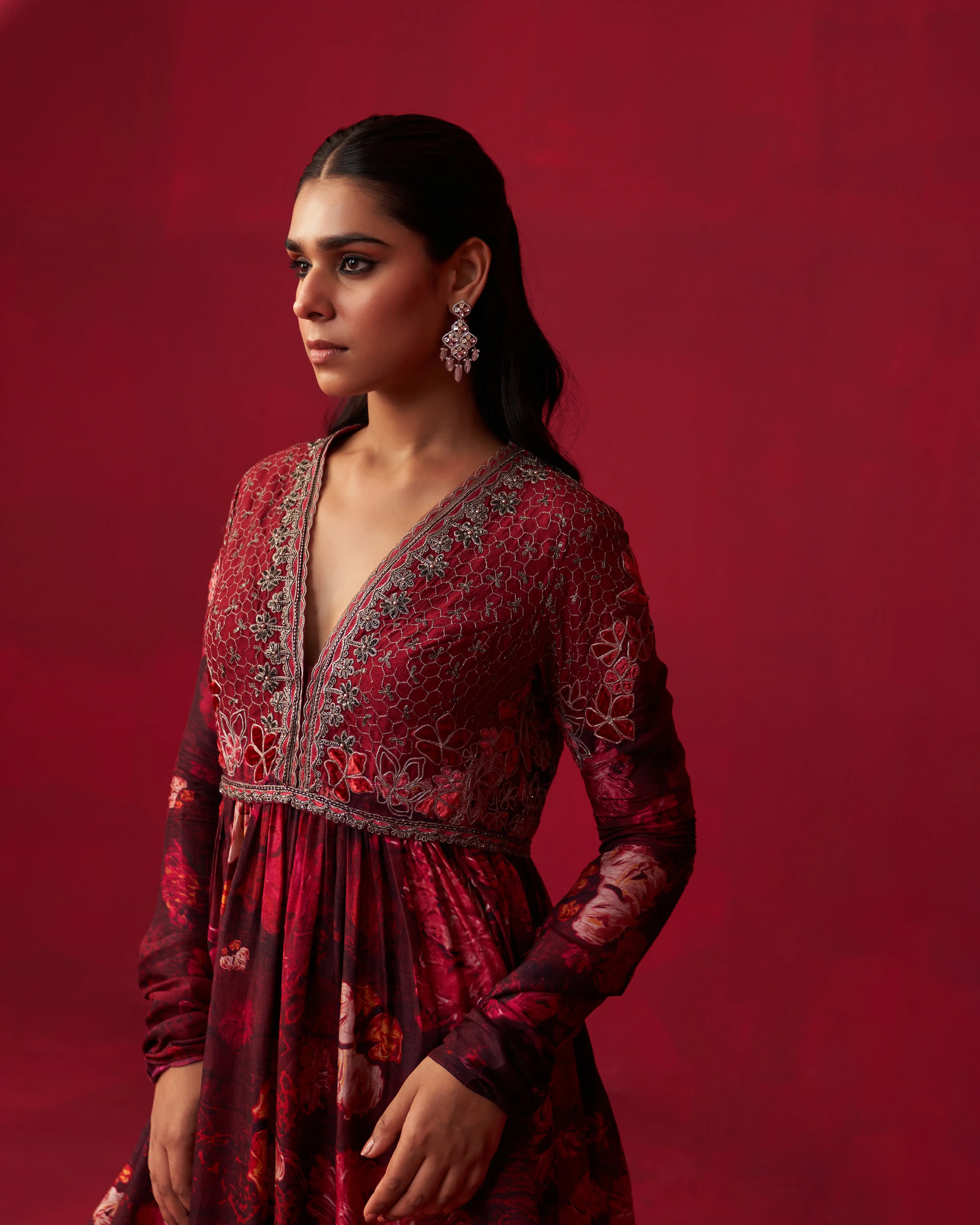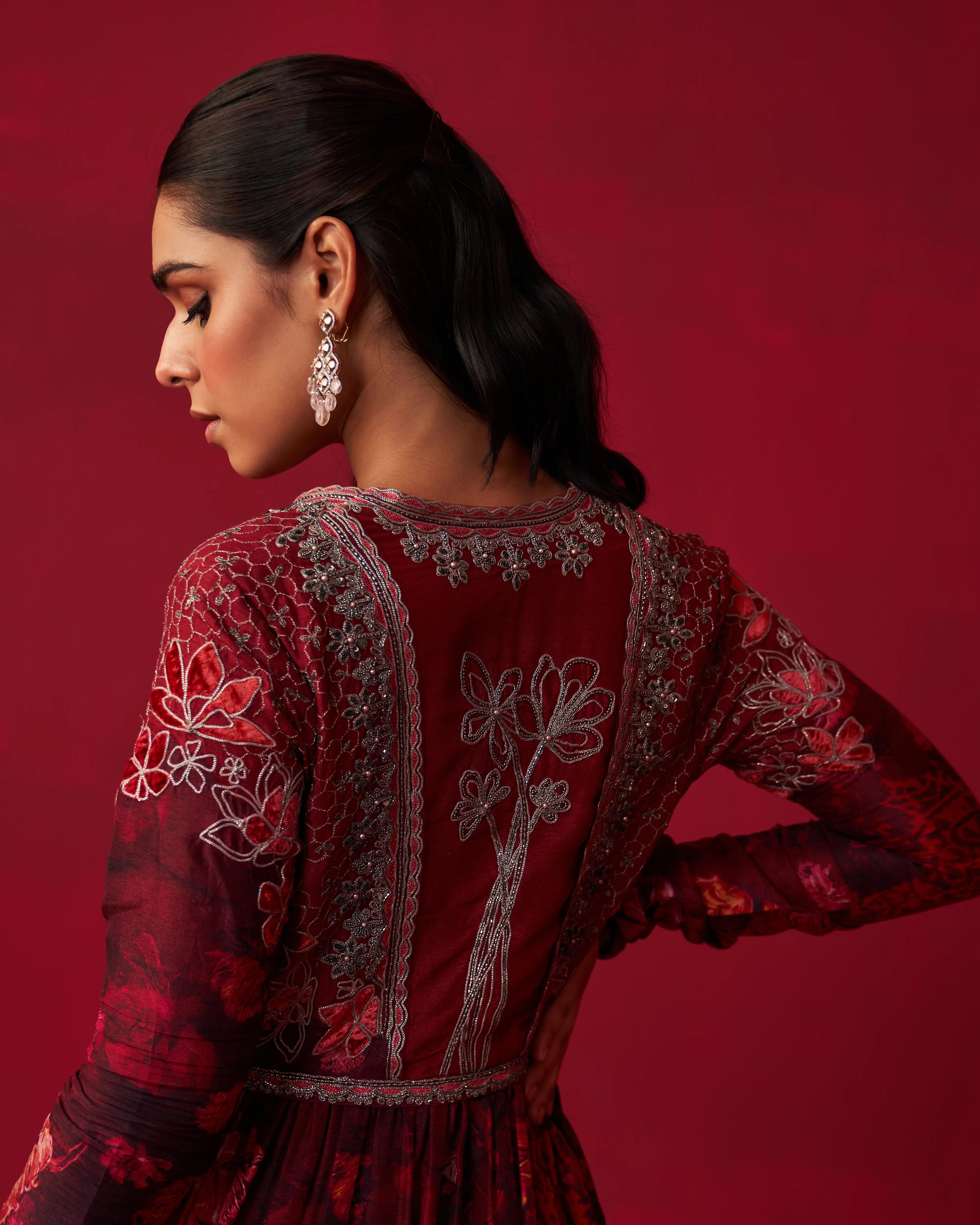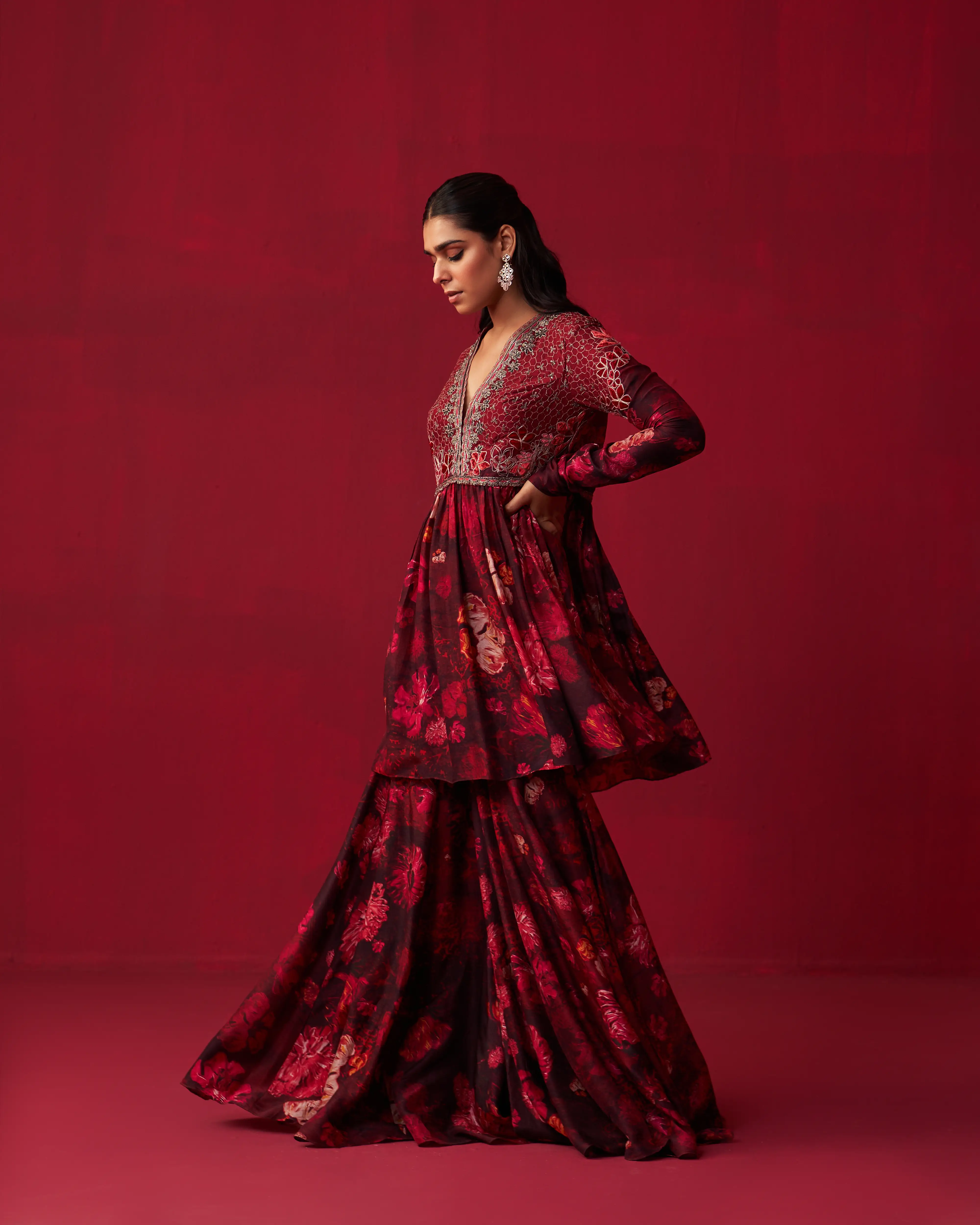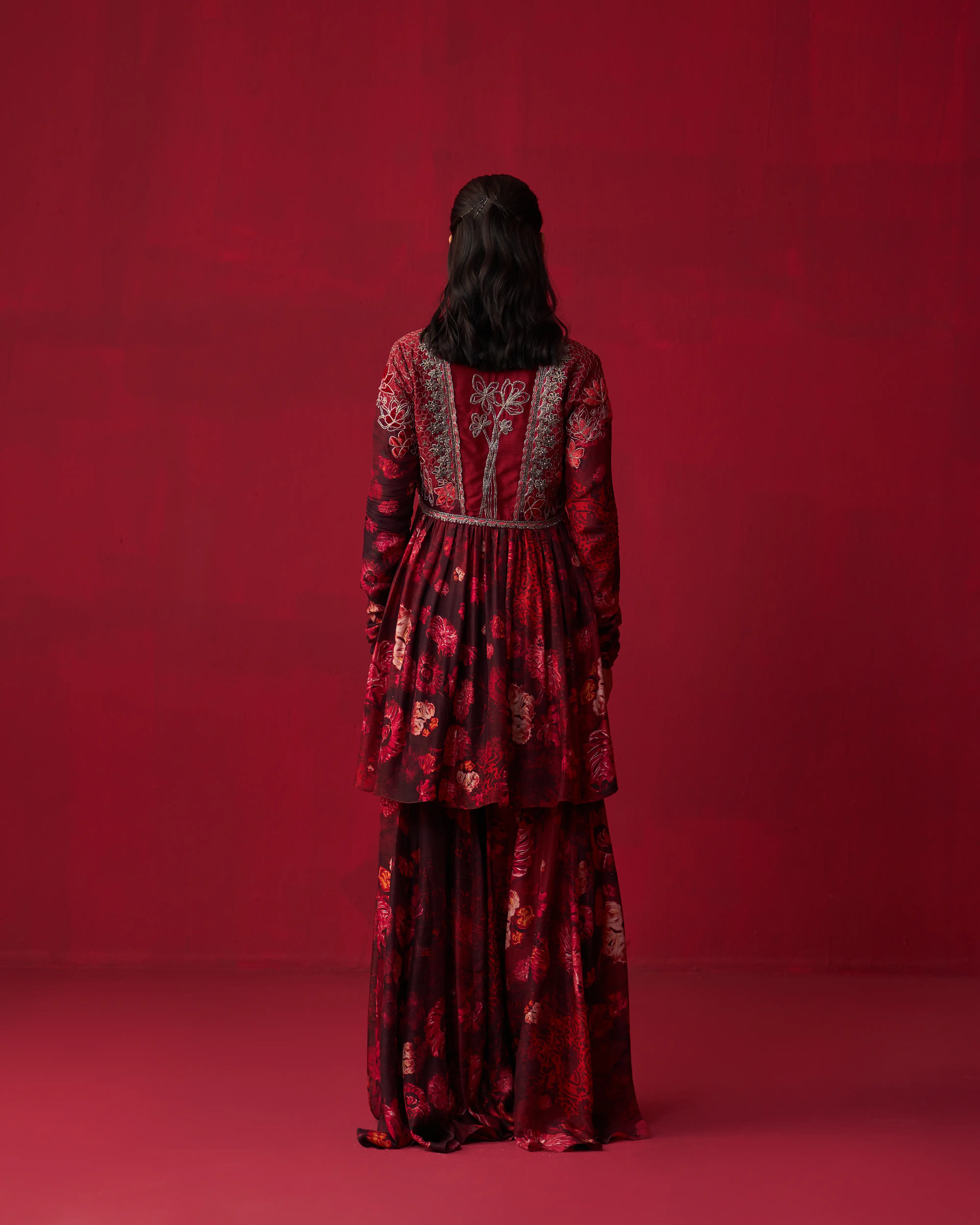 • Pink Russian Silk floral printed short anarkali with velvet patch embroidered bodice, paired with sharara